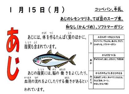 今日の献立は、あじのレモンマリネ、てぼ豆のスープ煮、和なし(缶)、ソフトマーガリン、コッペパン、牛乳でした。