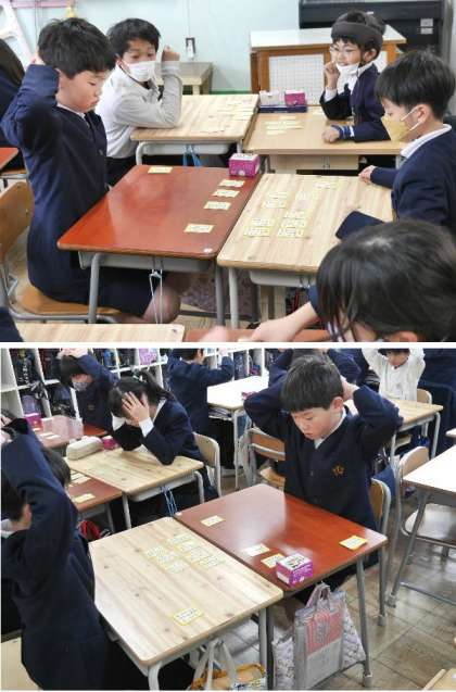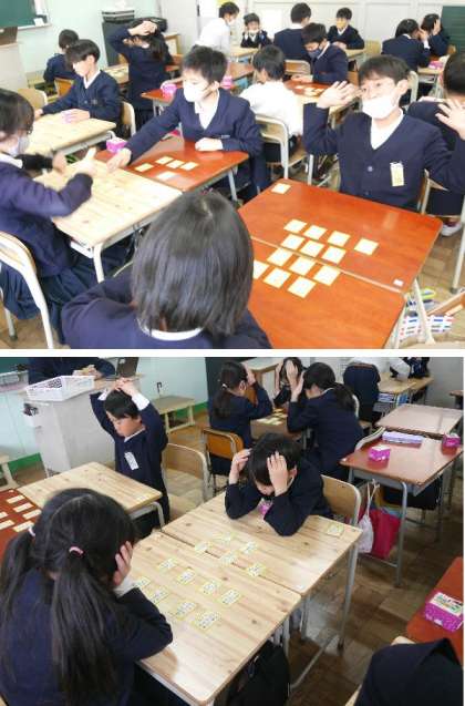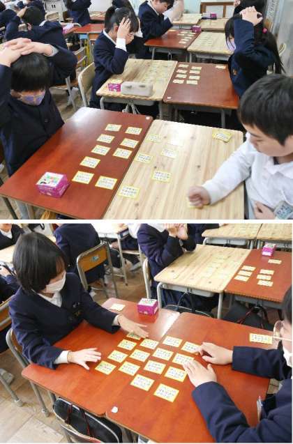 4年生では、百人一首を使ってカルタとりをして楽しんで学習していました。