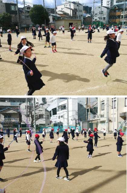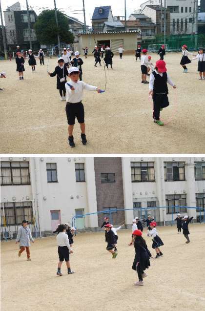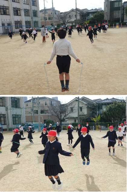 今日の20分休み時間の業間なわとびは2年生です。とても上手にとぶことができますね。