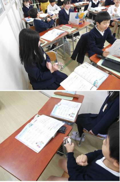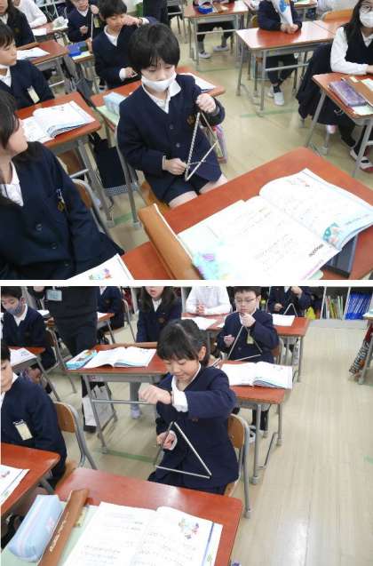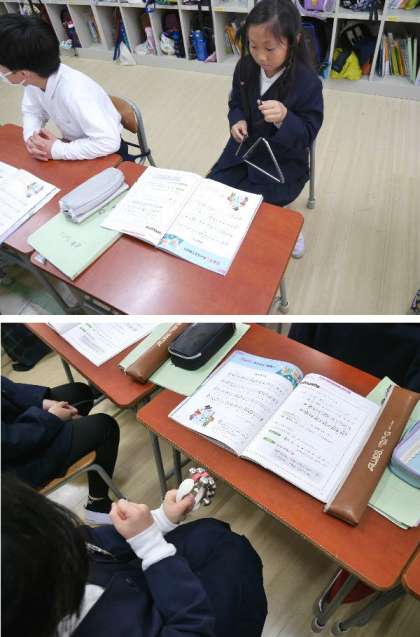 3年生が「雪のおどり」を歌っています。歌にあわせて、伴奏をトライアングルと鈴を鳴らしています。いい感じの曲に仕上がってきましたね。