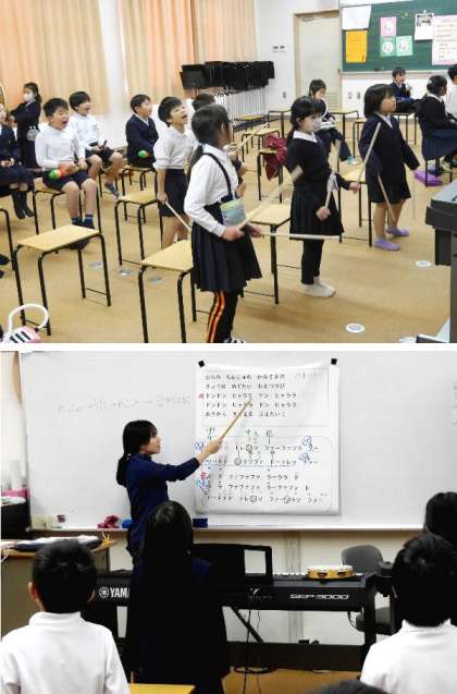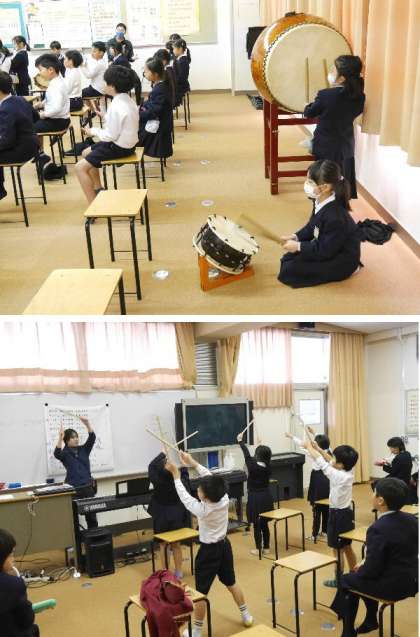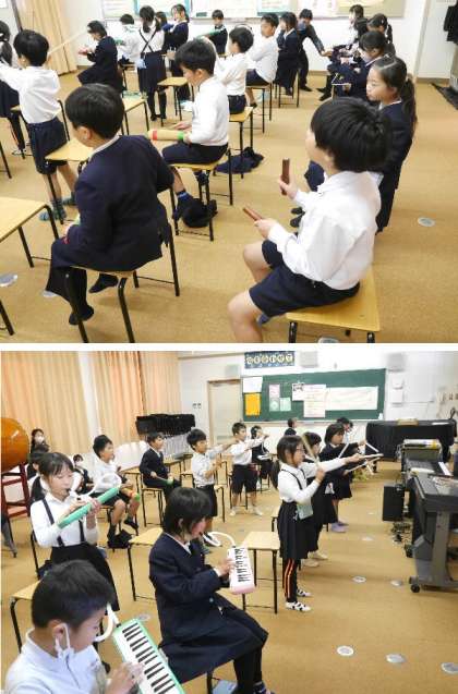 2年生が音楽室で、太鼓や鍵盤ハーモニカなどで、「村まつり」を歌っていました。おまつり気分で、生き生きと楽しく演奏して歌っています。