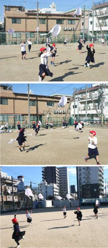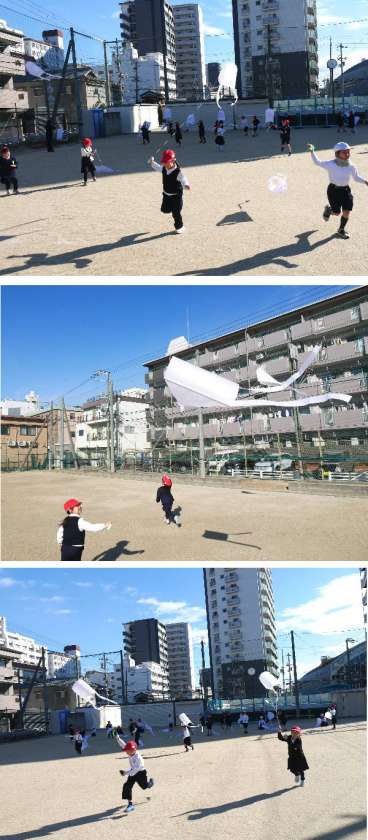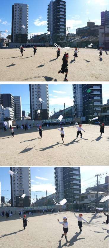 1年生が第2グランドに、自分で絵を描いた「たこ」を持っていきあげました。青空に「たこ」がまっすぐにあがっていきます。とても楽しかったですね。