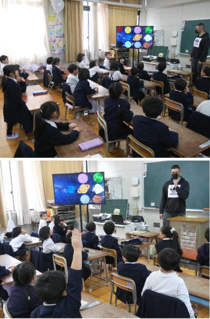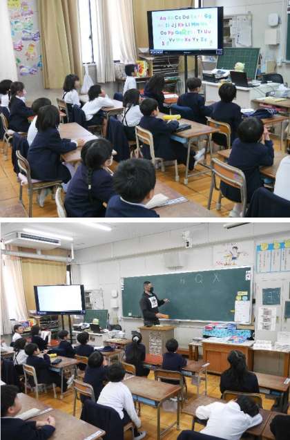 1年生の授業に、英語ネイティブのクリス先生が来てくれました。アルファベットやいろんな色を英語で言う練習をしていました。
