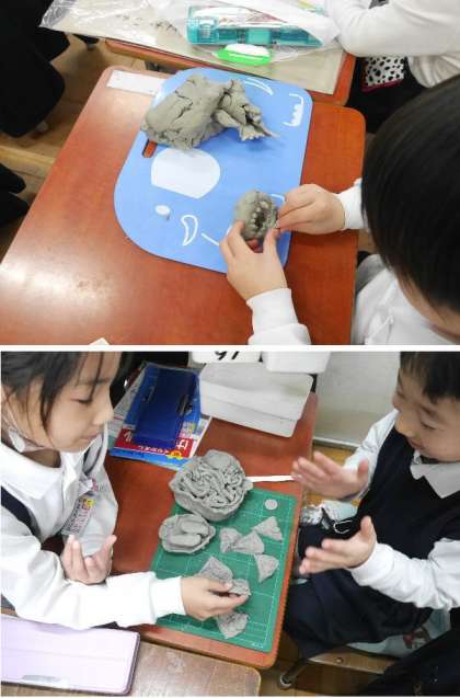 1年生では、ねんどを使っていろいろな物を作ります。節分にちなんで、いろいろな「おに」を作ったり、食べ物を作ったりしていました。