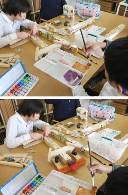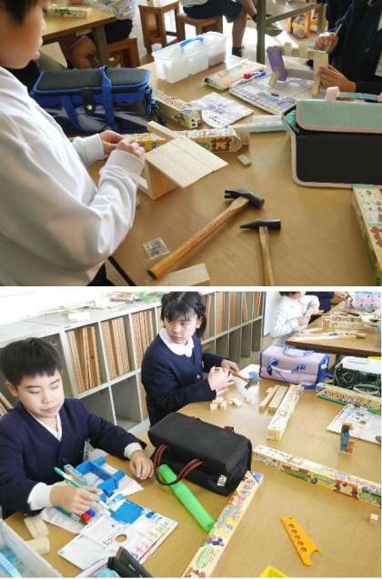 4年生では、木材をのこぎりで切ったり、くぎ打ちしたりして作品づくりをしています。いろいろな形の作品がしあがってきました。