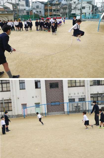 業間なわとびは、今日から大なわとびになります。大繩を1年生がとびこえてがんばっています。クラスで何回とびたかをかぞえます。