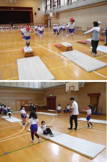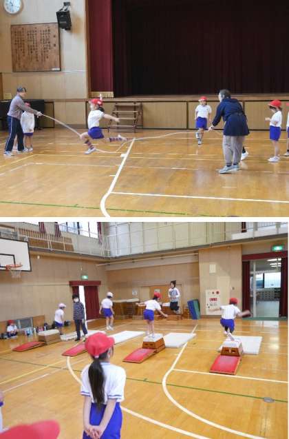 1年生の3クラスが体育館で体育をしています。それぞれ、マット運動、とび箱、大なわとびの練習をしていました。