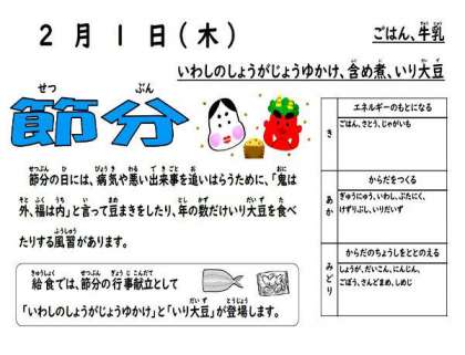 今日の献立は、いわしのしょうがじょうゆかけ、含め煮、いり大豆、ごはん、牛乳でした。「節分」の日の行事献立でした。