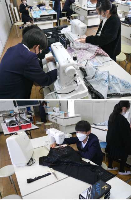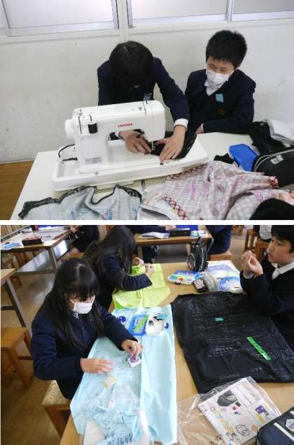 5年生の家庭科ではエプロンを作っています。今日は下糸をつけてミシンがけをしました。