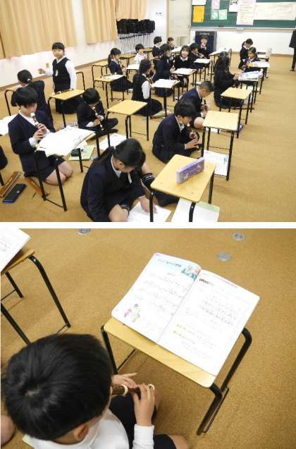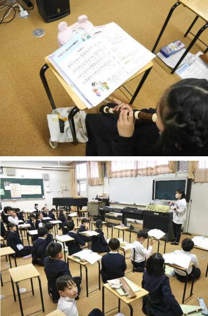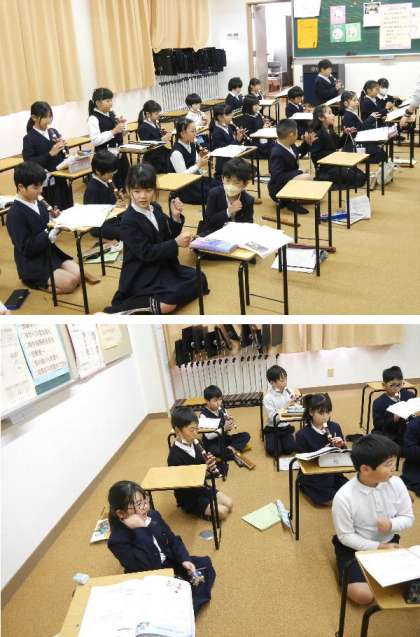 3年生がリコーダーの練習を音楽室でしています。リコーダーにトライアングルやすずも一緒に演奏していました。