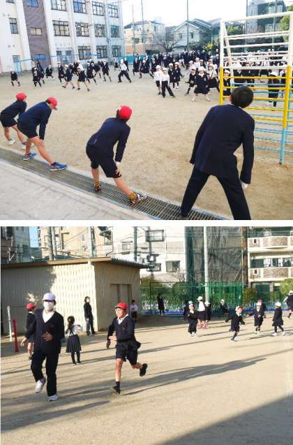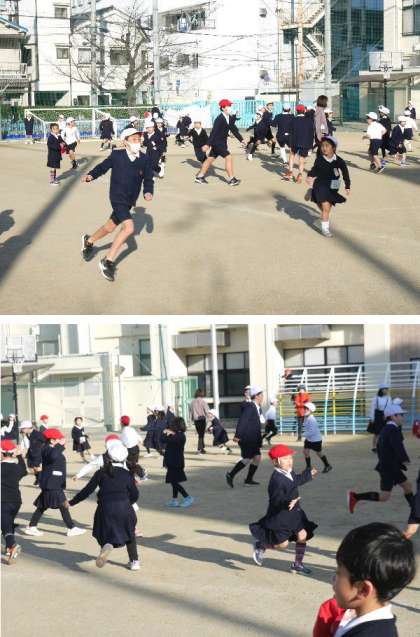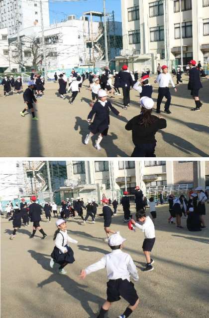 1年生と6年生のペア学年で児童会の運動集会がありました。運動委員が進行して、今日は1年生と6年生で「ふえおにごっこ」を行いました。運動委員が赤帽子で「おに」になってスタートです。白帽子がどんどんつかまって赤帽子に変わっていきます。