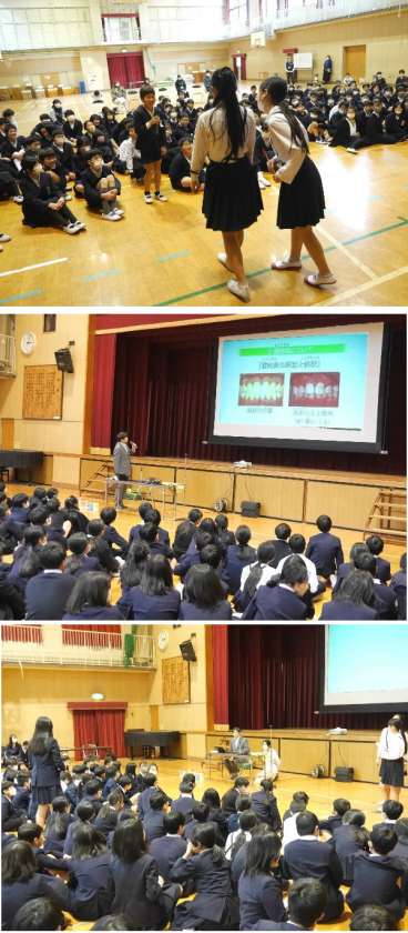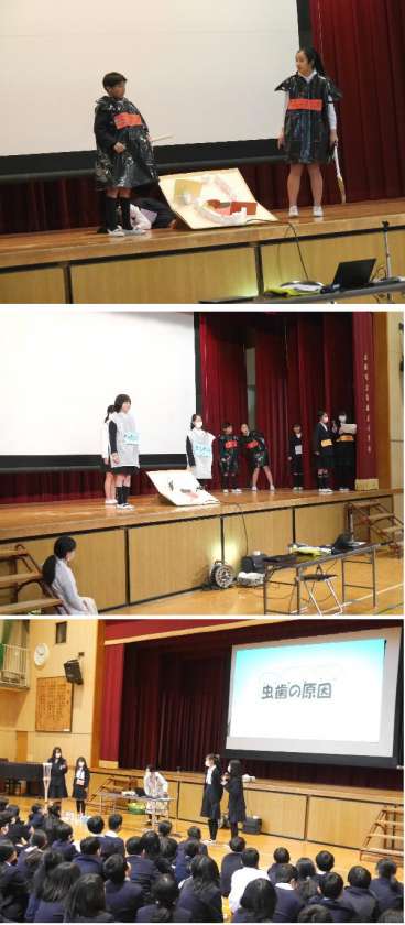 今日は、5・6年生の児童、歯科校医先生、保護者の方に講堂に集まっていただき、特に、歯の健康について学習しました。児童会の保健委員会の子どもたちが、歯の健康について調べたことを発表したり、劇をしてくれました。歯科校医先生に講評していただき、さらに歯の健康、歯肉炎について教えていただきました。最後に活発な質疑応答で校医先生に質問をして答えていただきました。ありがとうございました。