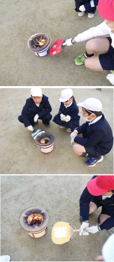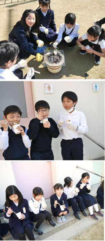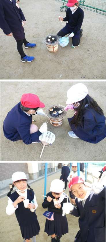 3年生では、七輪を使って火をおこし、おもちを焼いていただきました。なかなか、炭に火がつかないので苦労していました。おもちはしょうゆをつけておいしかったです。