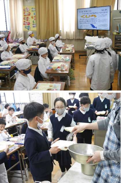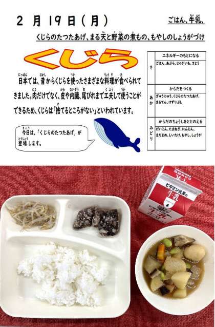 今日の献立は、くじらの竜田揚げ、まる天と野菜の煮もの、もやしのしょうがづけ、ごはん、牛乳でした。「くじら」のおかわりに列ができます。