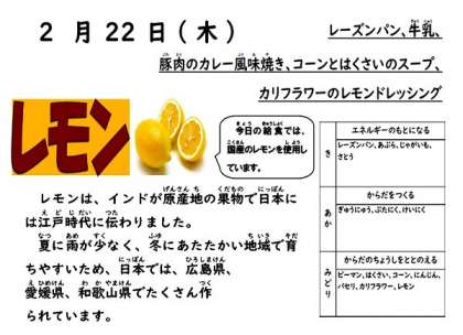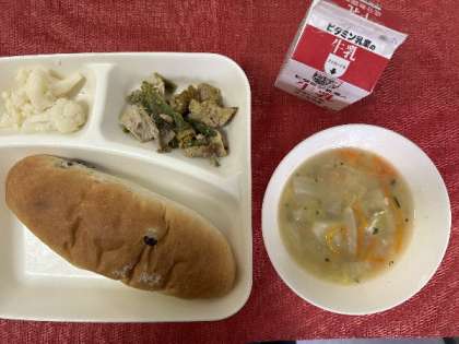 今日の献立は、豚肉のカレー風味焼き、コーンと白菜のスープ、カリフラワーのレモンドレッシング、レーズンパン、牛乳でした。