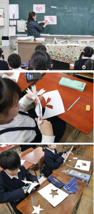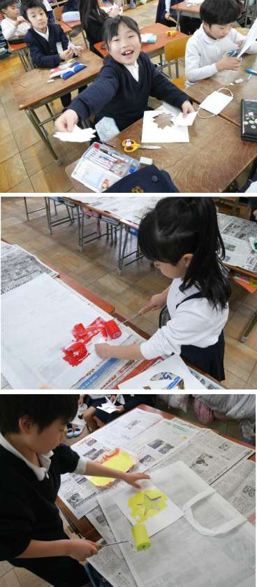 2年生では、画用紙を切り抜いた型紙を使って、作品入れ袋のデザインをしていました。