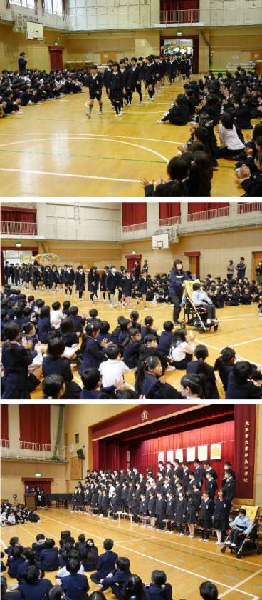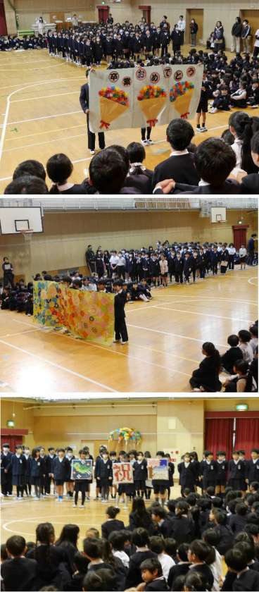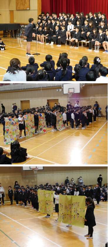 今日は、「卒業をお祝いする会」が講堂でひらかれました。5年生が進行してすすめてくれました。まず、1年生から5年生の拍手のなか、花道をとおって6年生をお迎えしました。6年生に児童代表のことばがあり、各学年からお祝いのメッセージが紹介されました。