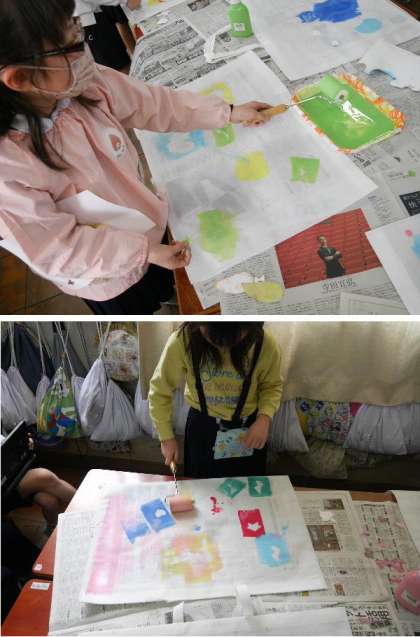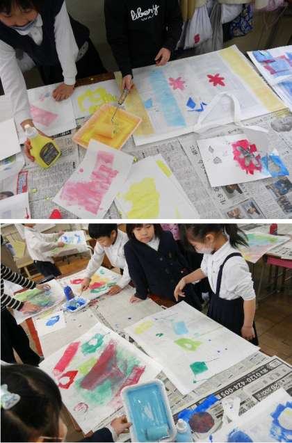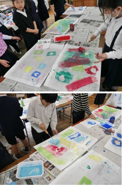 2年生では、作品をまとめて持ち帰る袋に、型紙を使ったデザインを印刷していました。小学校での作品を思い出として大切に保管してくださいね。