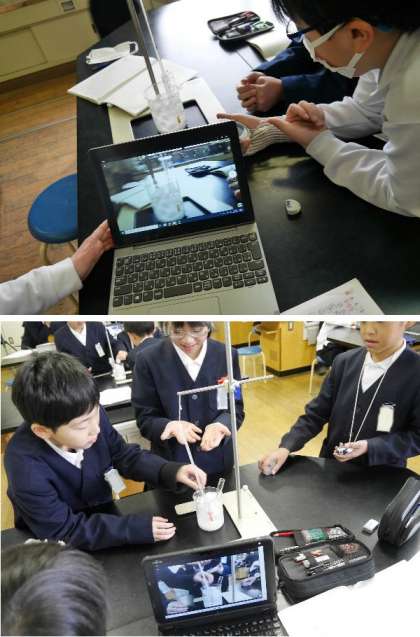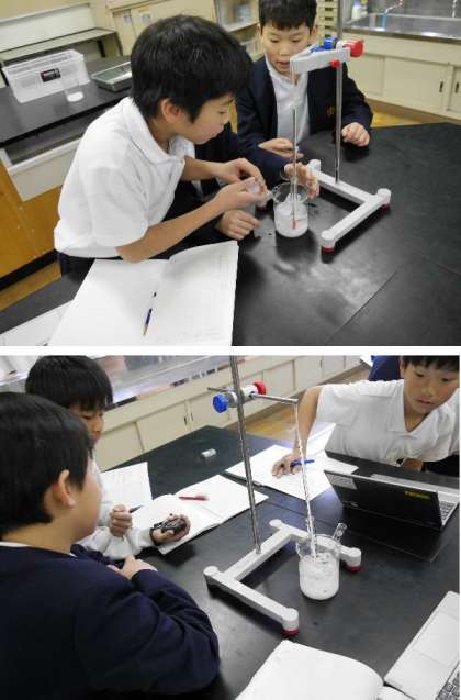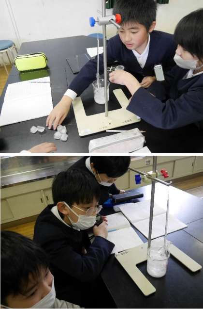 4年生が理科室で実験をしています。ビーカーに水と食塩をまぜて氷をいれて、その中に試験管に水を入れて観察していきます。