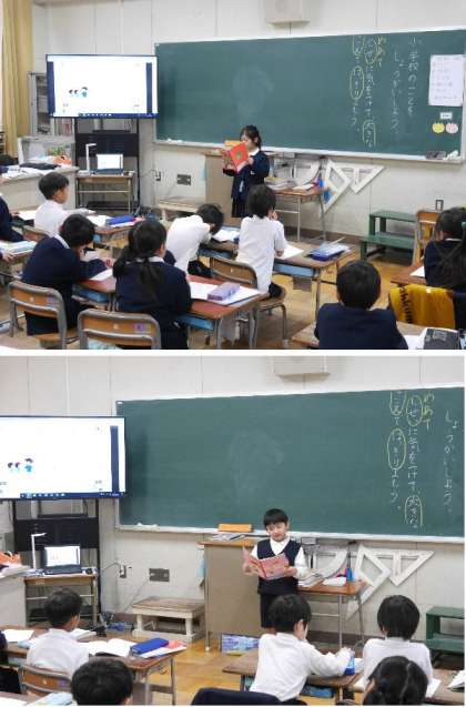 1年生の国語では、もうすぐ2年生になります。新しく1年生になる子たちに小学校のことを紹介する文章を作って発表しています。小学校ですることを紹介していきます。
