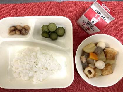今日の献立は、関東煮、きゅうりの梅風味、とら豆の煮もの、ごはん、牛乳でした。