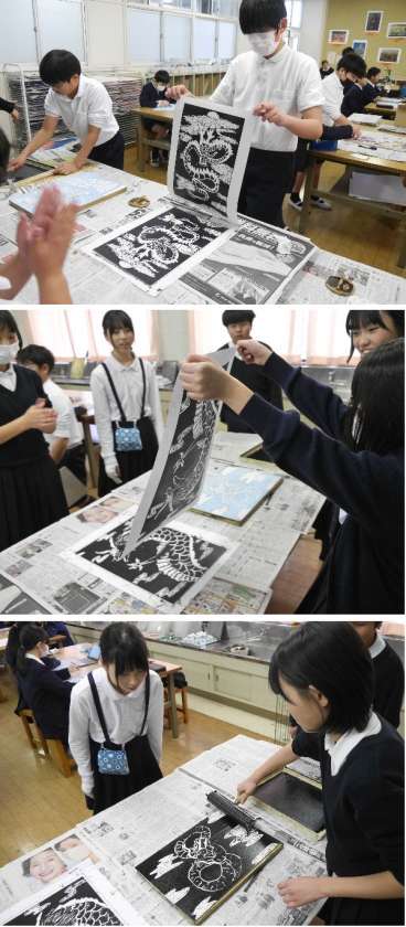 6年生では、龍の版画を彫っていました。今日は出来上がった版画の印刷です。印刷すると見事な作品ができあがってきました。さすが6年生です。