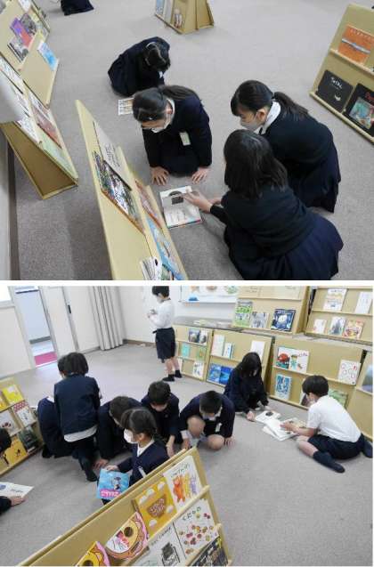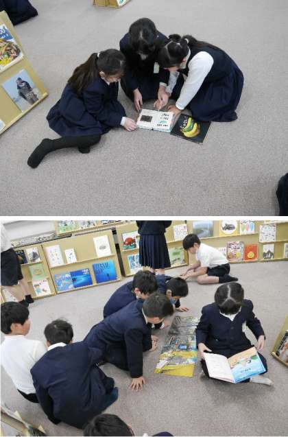 えほん広場は、お昼休みや20分休憩時に閲覧できます。各学級ごどでも1時間じっくりと閲覧する時間もあります。3年生が楽しそうに見ていました。