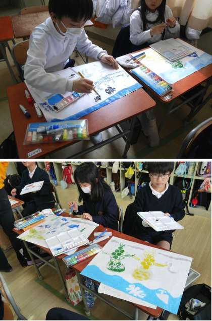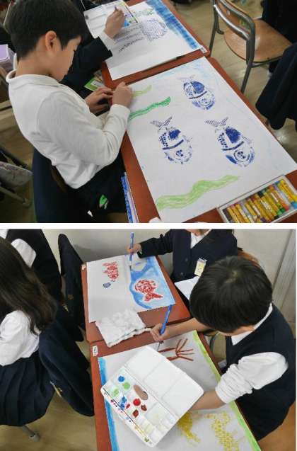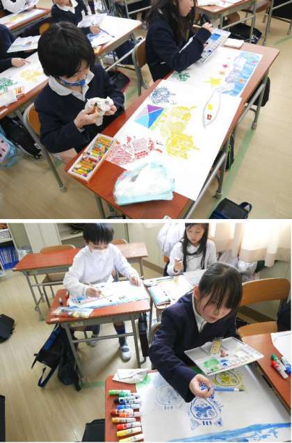 3年生では、厚紙にでこぼこ貼り付けて版画をした絵に、絵の具で背景をいれてしあげています。
