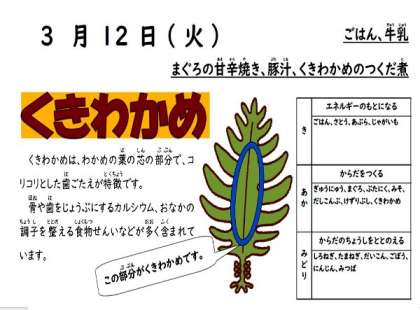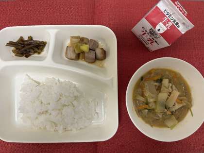 今日の献立は、まぐろの甘辛焼き、豚汁、くきわかめのつくだ煮、ごはん、牛乳でした。