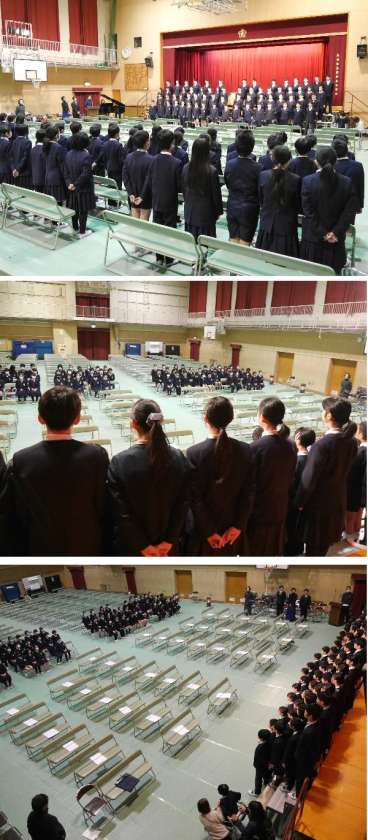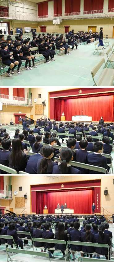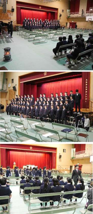 5年生と6年生が講堂で、卒業式の予行をおこないました。当日どおりの進行や司会ですすめました。