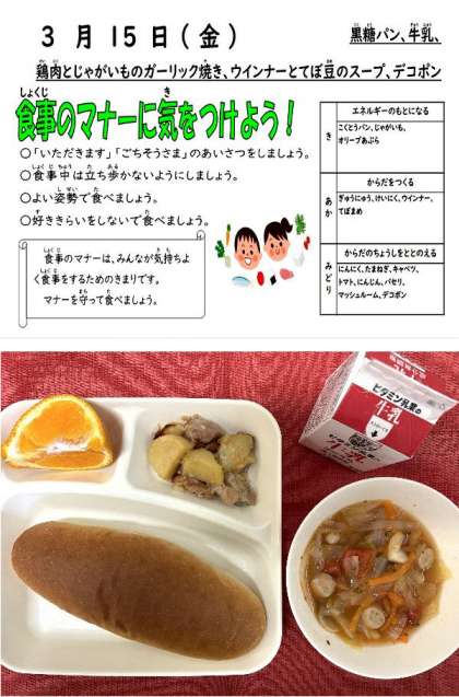 今日の献立は、鶏肉とじゃがいものガーリック焼き、ウインナーとてぼ豆のスープ、デコポン、黒糖パン、牛乳でした。