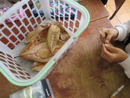 ドングリやまつぼっくり、枯れ葉を使って何か作っています。