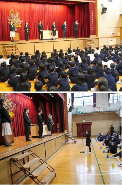6年児童の代表から今年の抱負などの挨拶があり、最後に全員で校歌を歌いました。