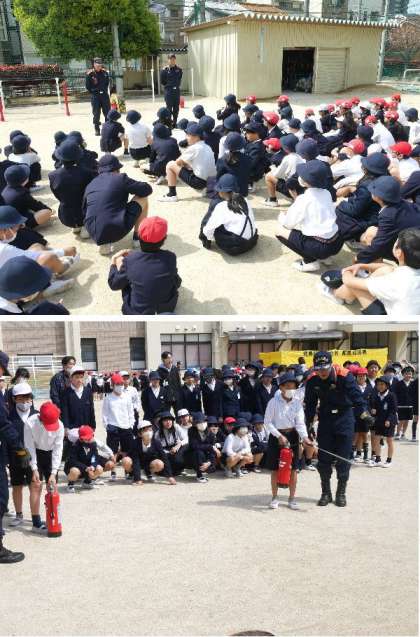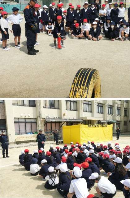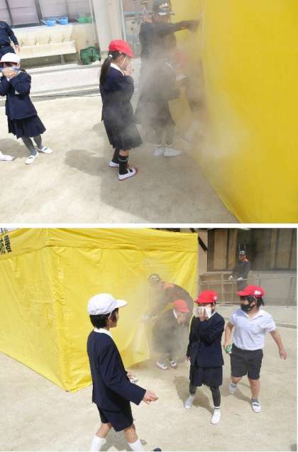 全体の避難訓練のあと、5年生は水消火器の体験をしました。3年生は煙中体験をしました。