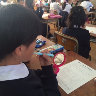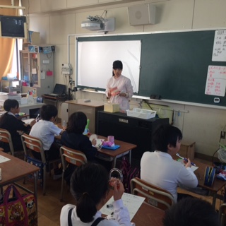 今日は、4年生が歯の磨き方を習うとともに、フッ化物塗布をしていただきました。講師は歯科校医さんと歯科衛生士さんです。みんな真剣に話を聞いて、磨き方の練習をしました。