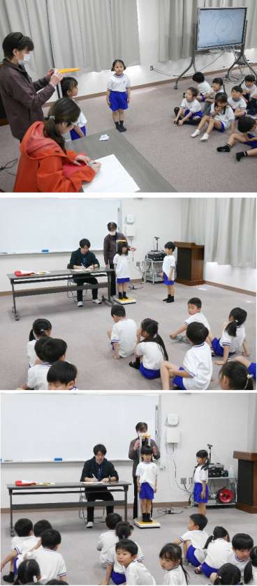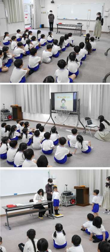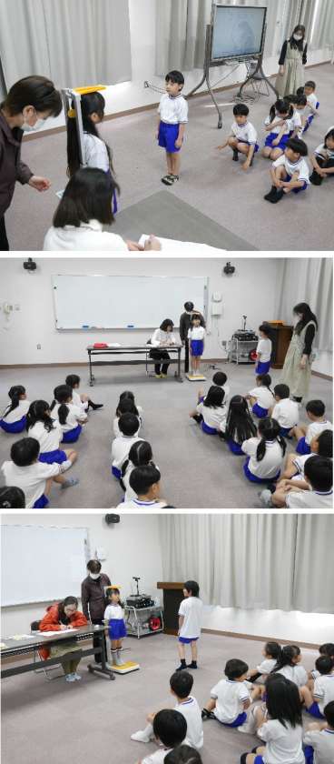 1年生が発育測定で身長と体重をはかっています。保健室の先生から、「朝ごはんをたべよう」についてのお話しがありました。