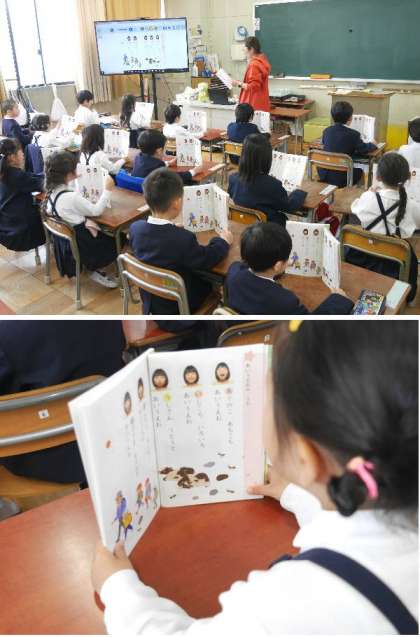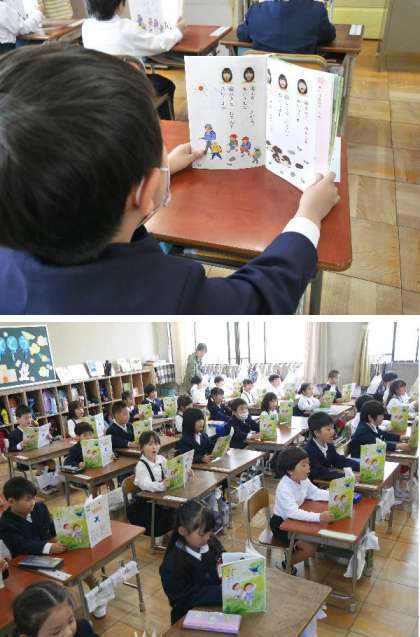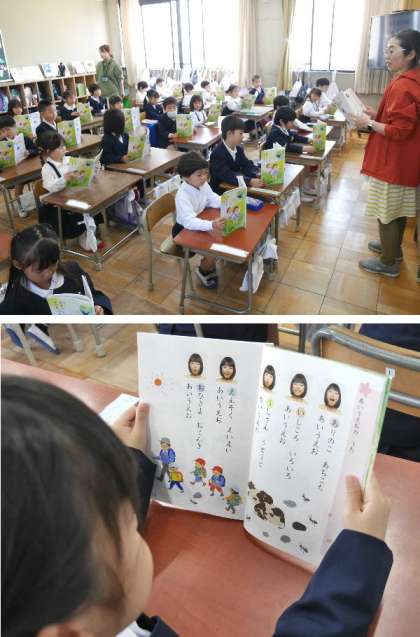 1年生が新しい教科書を持って、「あいうえおの うた」を音読しています。しっかり声を出して勉強していきましょう。