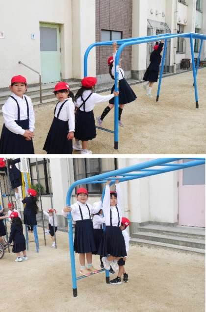 1年生も、運動場で、竹馬や一輪車、遊具などで楽しく遊んでいます。