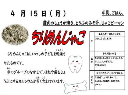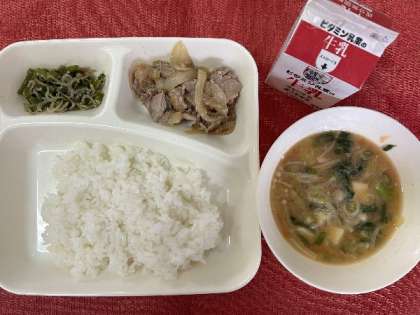 今日の献立は、豚肉のしょうが焼き、とうふのみそ汁、じゃこピーマン、牛乳、ごはんでした。