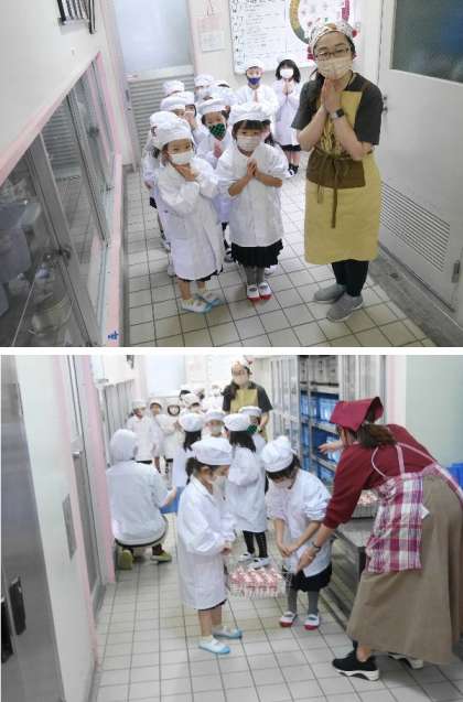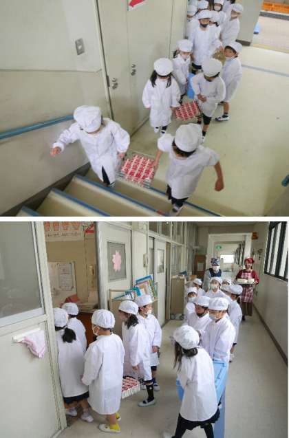 先週は、6年生が、給食の食缶を運んだり配膳のお手伝いをしてくれました。今週からは、1年生が自分で運んで給食の配膳をします。皆で協力しあって食缶を運んでがんばっています。