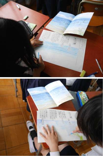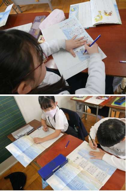 4年生の国語では、教科書の「水平線」の詩をていねいに視写しています。空白部分には絵も書き写しています。