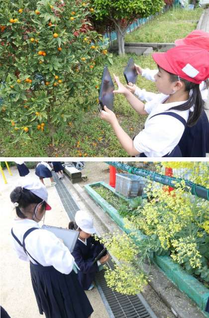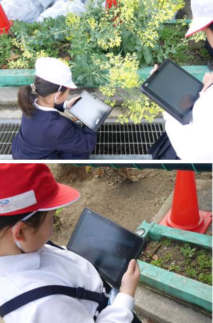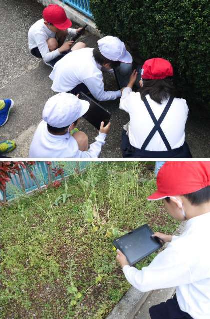 3年生が、校庭の草花や虫などを観察しています。一人一台のタブレットで写しているところです。