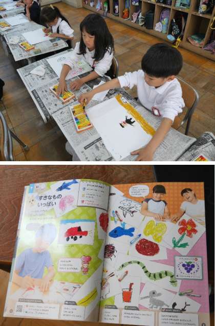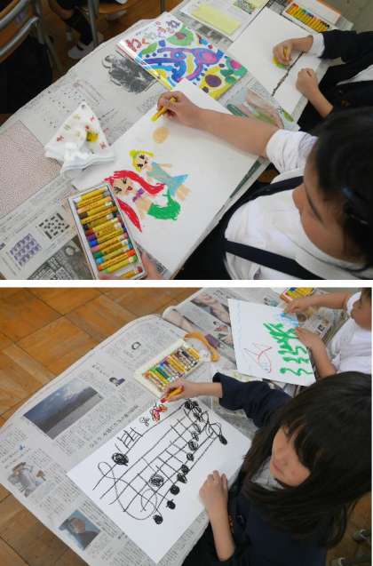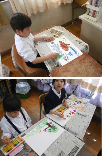 1年生が「すきなものいっぱい」を画用紙に描いています。たくさんのすきなものが集まりました。