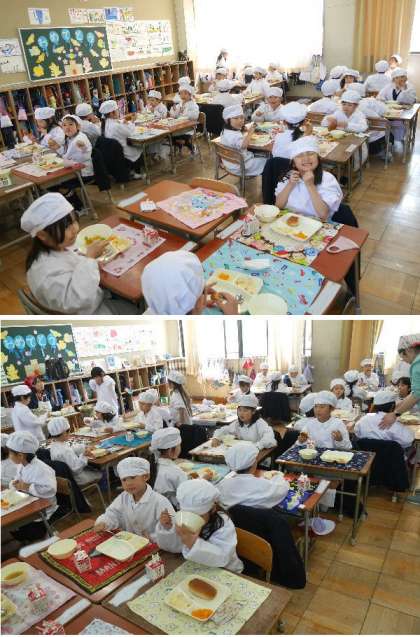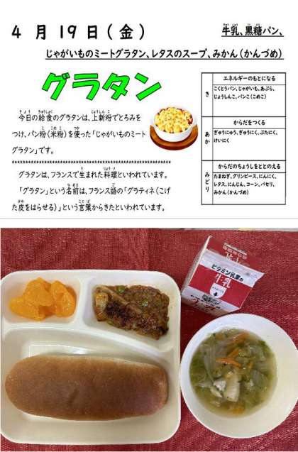 今日の献立は、じゃがいものミートグラタン、レタスのスープ、みかん(缶)、牛乳、黒糖パンでした。