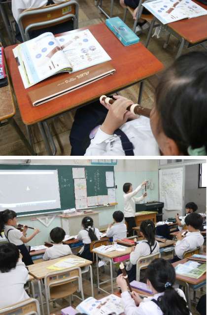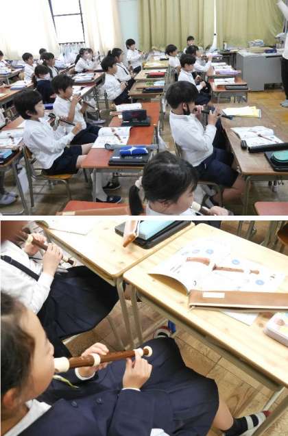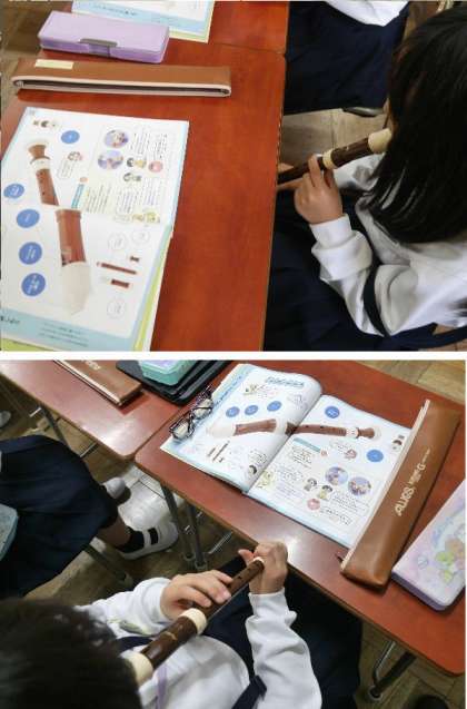 3年生の音楽では、はじめて、リコーダーをふく練習をしていました。