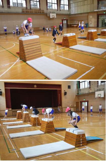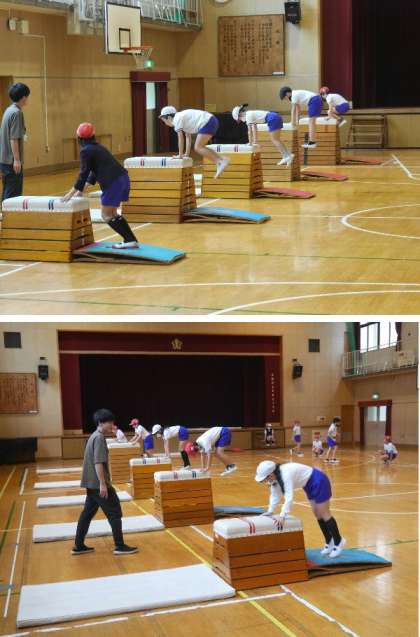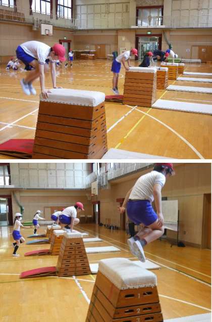 6年生の体育では、とび箱の練習をしています。足をなかぬきして飛び越えます。