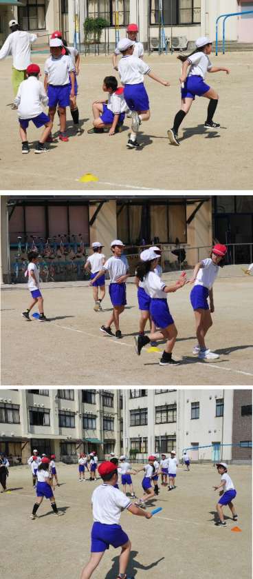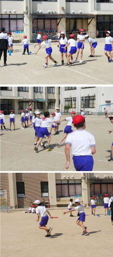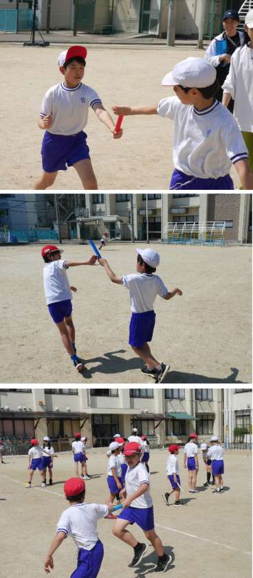 5年生ではリレーの練習をしています。バドンの受け渡しがスムーズにできるように、何度も練習です。