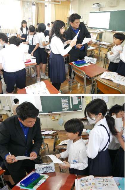 5年生の英語の授業に、ネイティブのボア先生が来てくれました。好きなものを英語で質問して答えます。