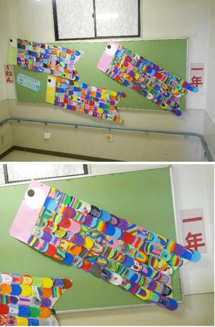 1年生の掲示板に3匹の鯉のぼりが登場です。うろこの1枚ずつを子どもたちが描きました。