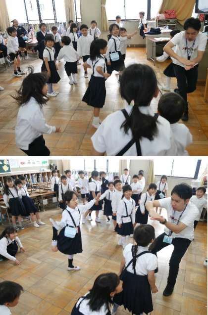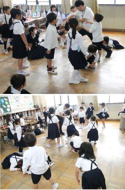 1年生が忍者修行の練習です。先生が忍者になりきって、手裏剣をなげています。先生にあわせて身体を動かします。